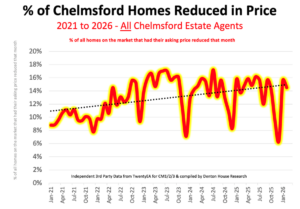 Across the last 5 years, 1 in every 7.5 Chelmsford homes (13.29%) reduced their asking price each month.
