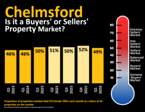 Understanding whether the current property market favours buyers or sellers is key to making the right call. If you follow my regular Chelmsford property market updates, you will know one of the most dependable ways to assess the property market is by observing the percentage of homes marked as “Sold STC” or “Under Offer” compared to the total number of properties on the market.