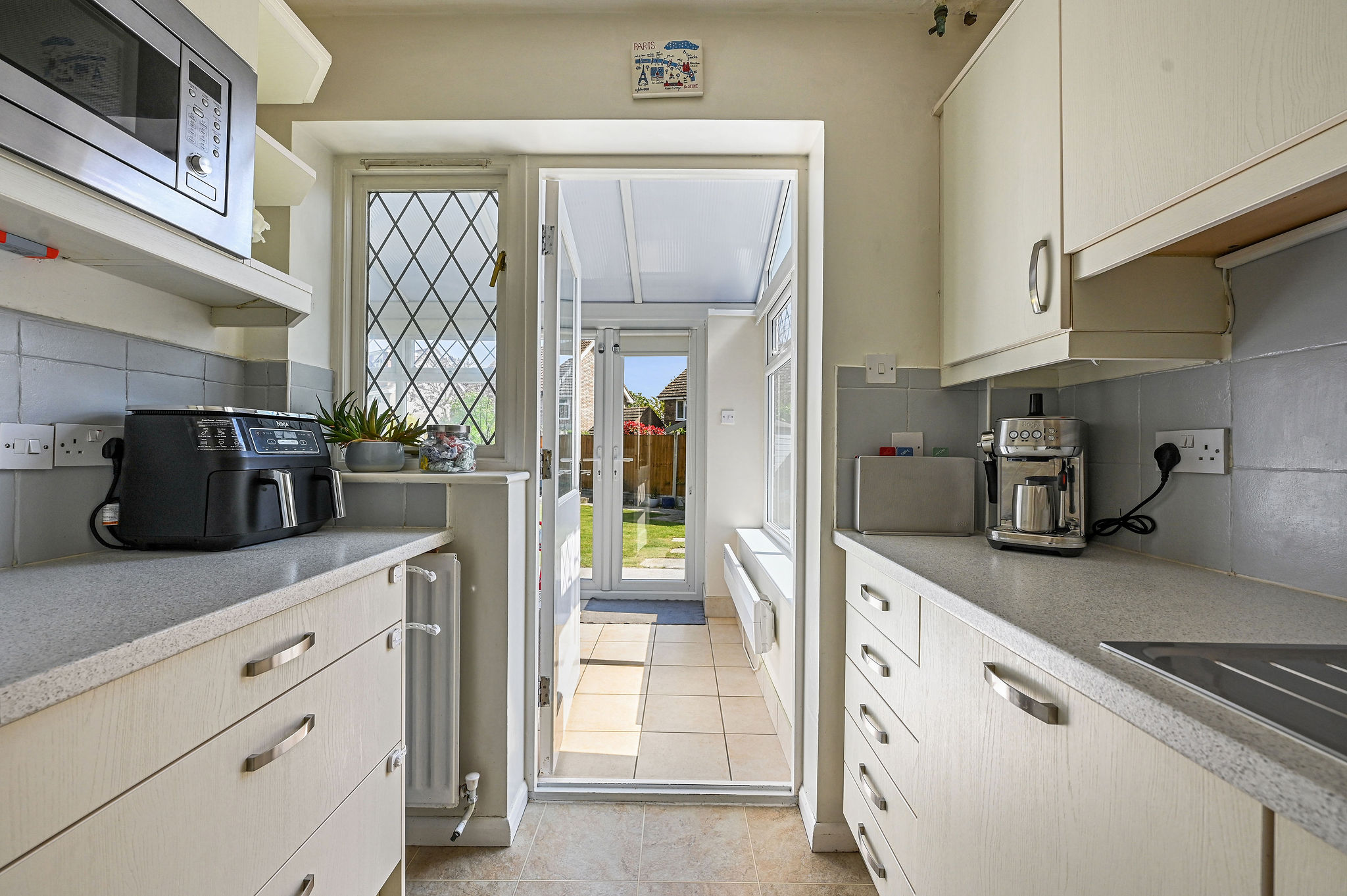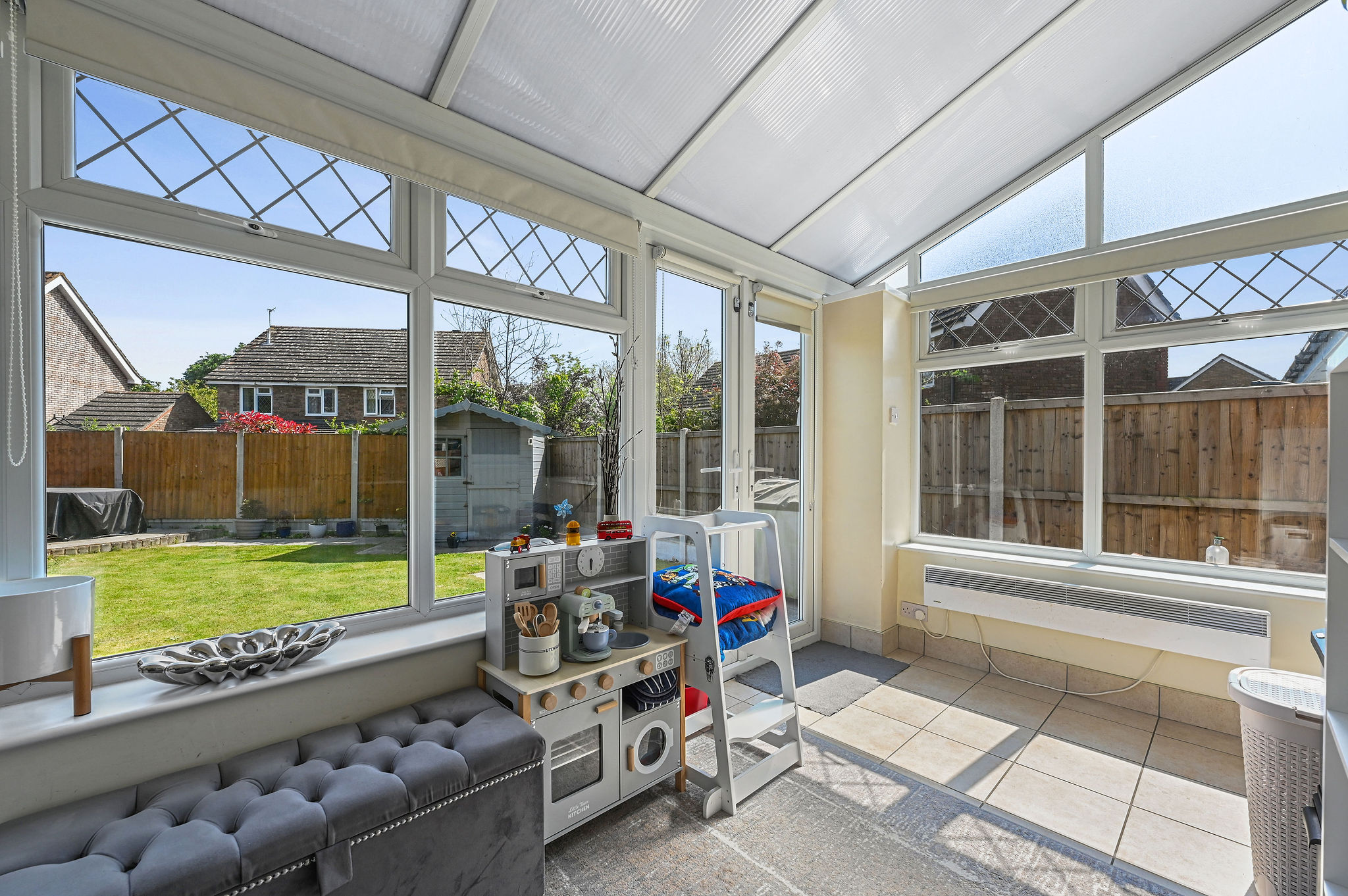 The home's main features include a separate kitchen, separate living room, separate dining room, a conservatory, two bathrooms, two double bedrooms, a single bedroom, a rear garden, garage, and off-road parking for three cars.