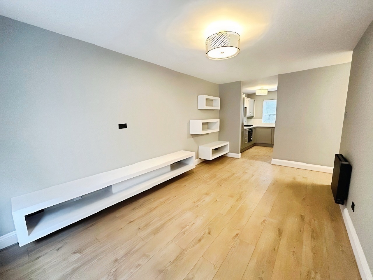 LIVING ROOM 16'10 x 9'7 Recently refurbished with a bay window with Venetian blinds to the rear aspect with feature window seat, modern floating shelf units, new electric wall heater, new flooring,