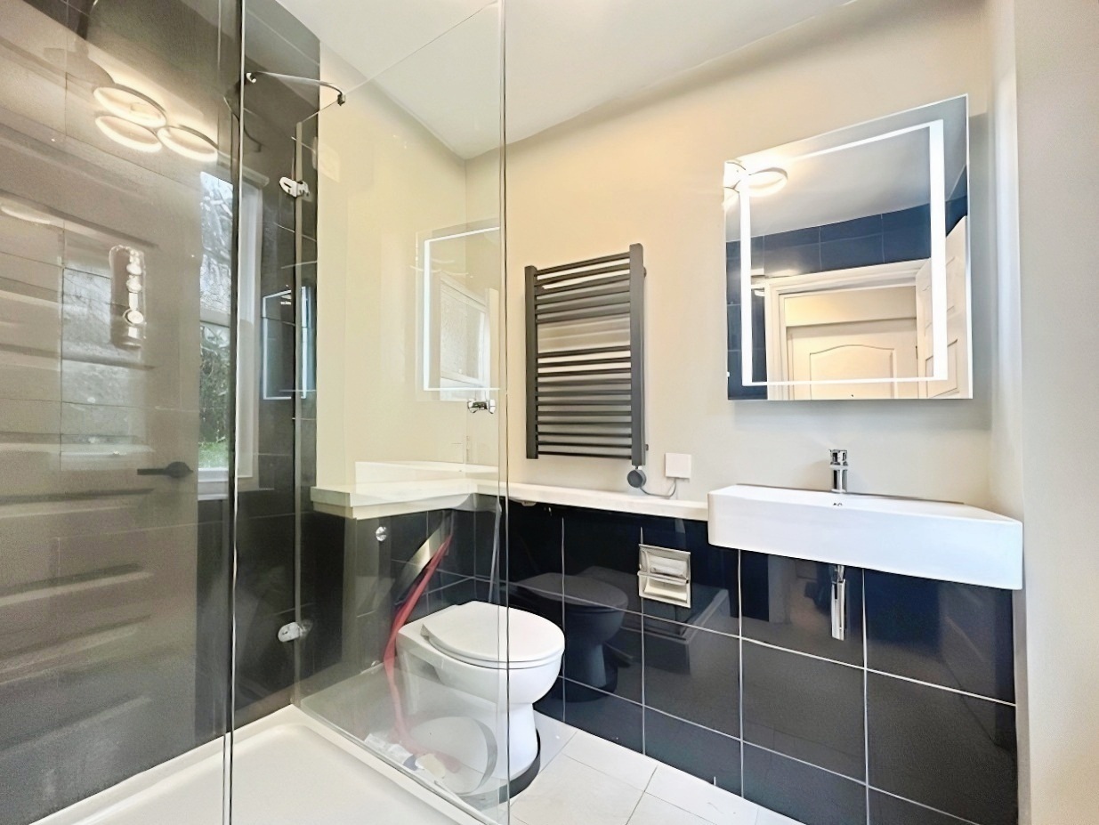 SHOWER ROOM Obscure window to rear. Low level flush w/c, inset sink and shower cubicle with rainhead shower over. Mirror and built in wall mounted units.