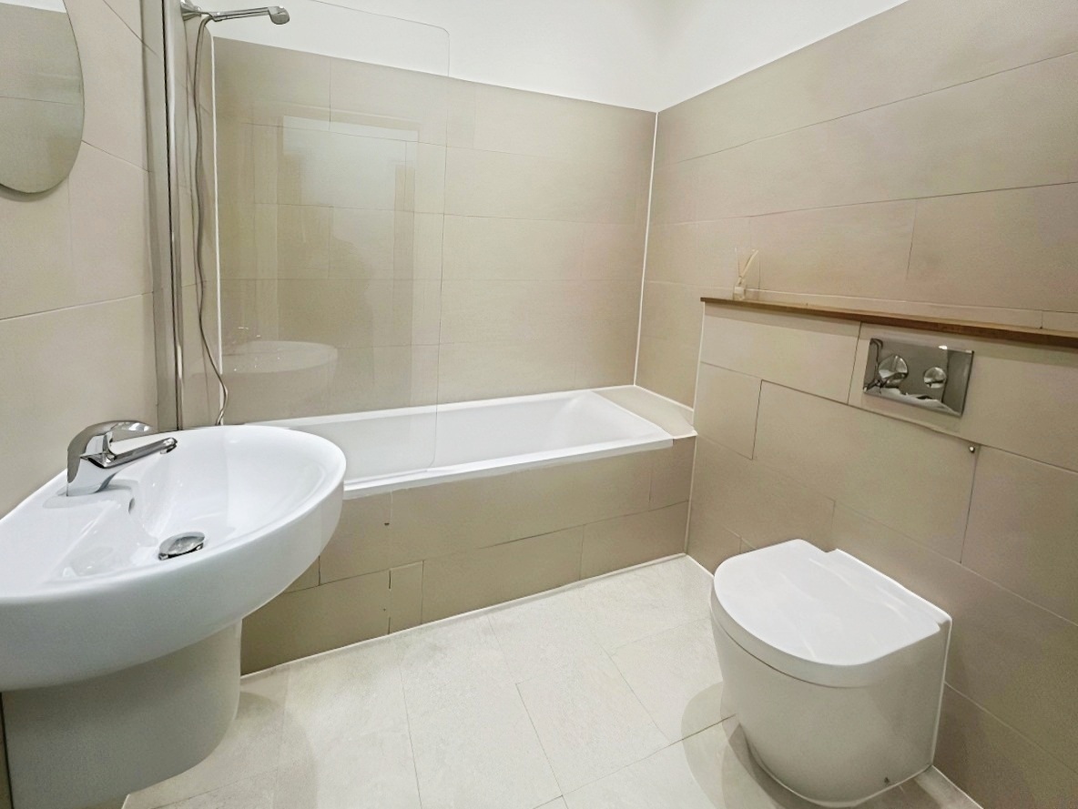 BATHROOM Three piece bathroom suite comprising a wall hung wash basin, low level flush w/c and bath with mixer taps and shower attachment. Chrome heated towel rail.