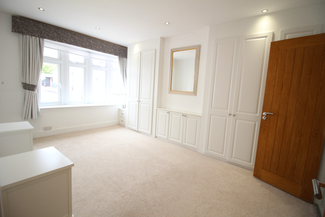 - Principal bedroom with bay window, fitted wardrobes, and contemporary en-suite shower room