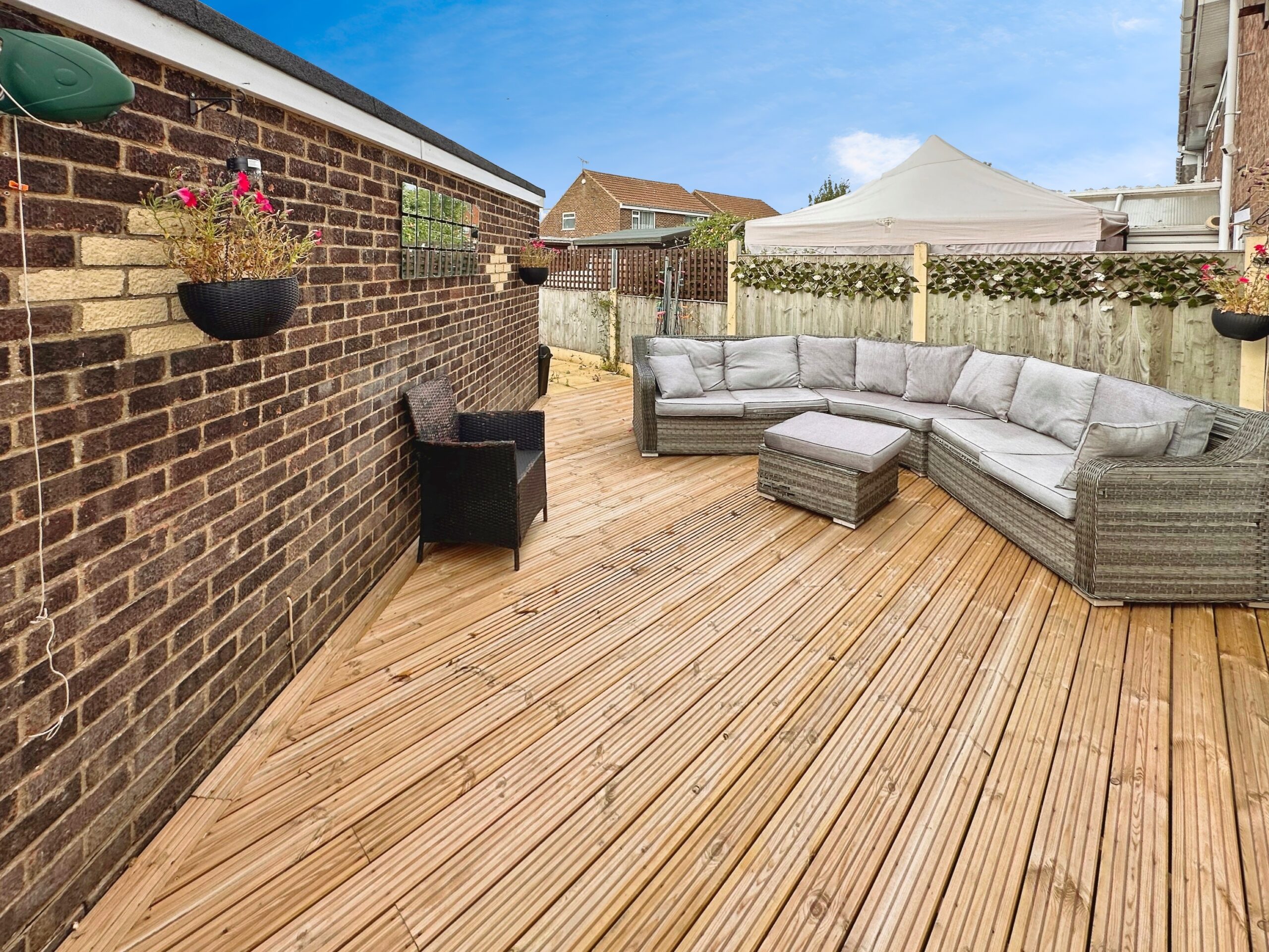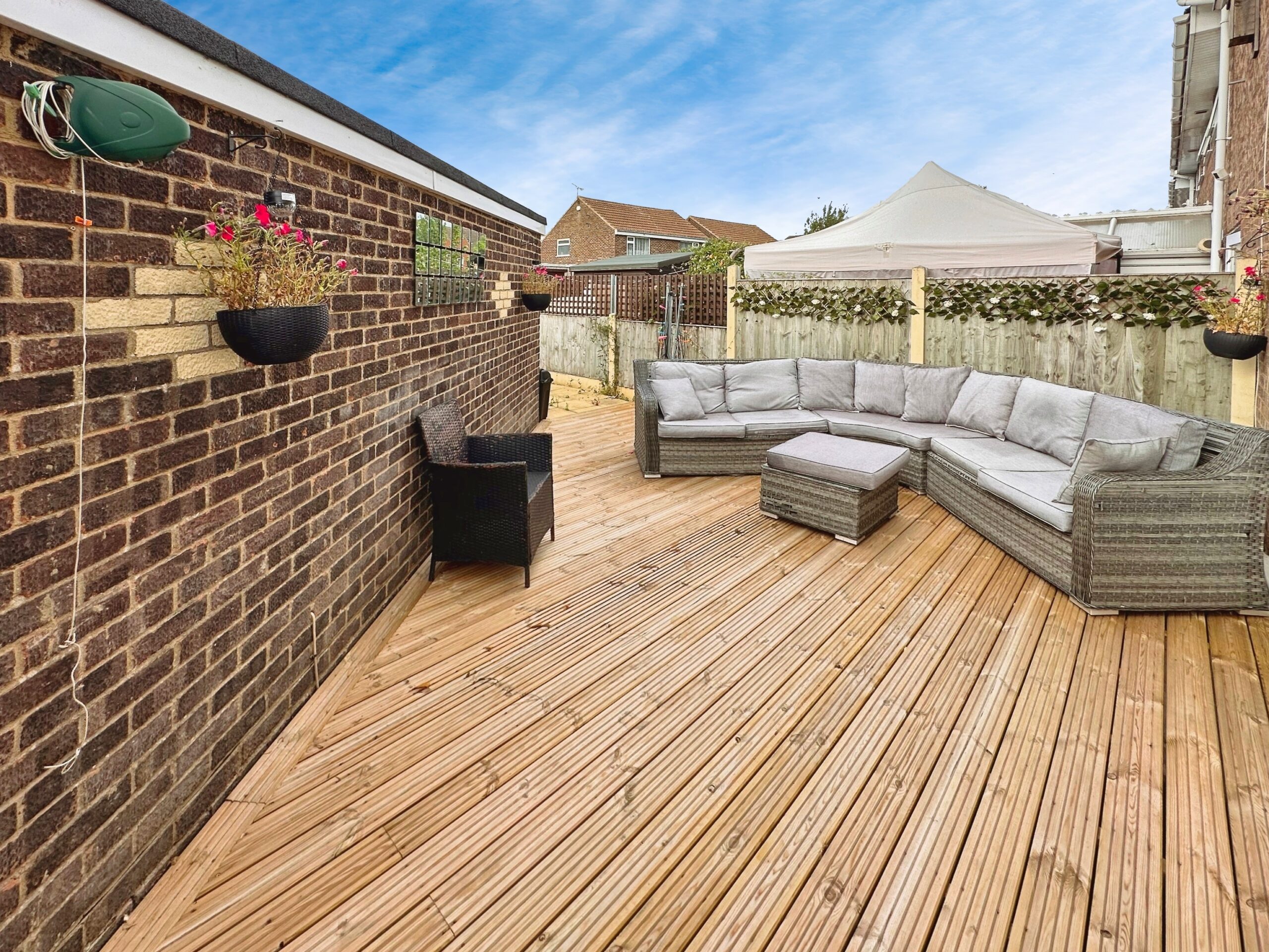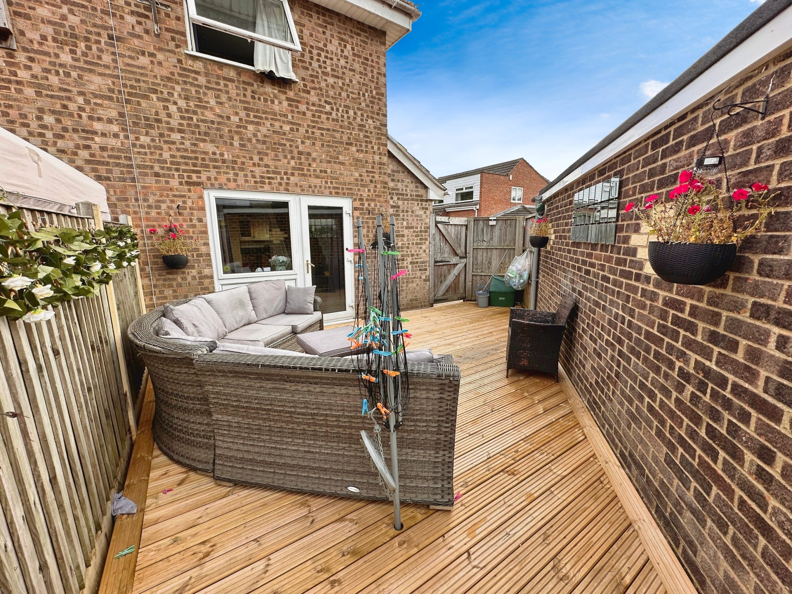 Outside, the enclosed Rear Garden provides a low maintenance area to relax, being mainly decked with a patio area beyond. There is a driveway for one car which leads to the garage which is accessed via an up and over door.