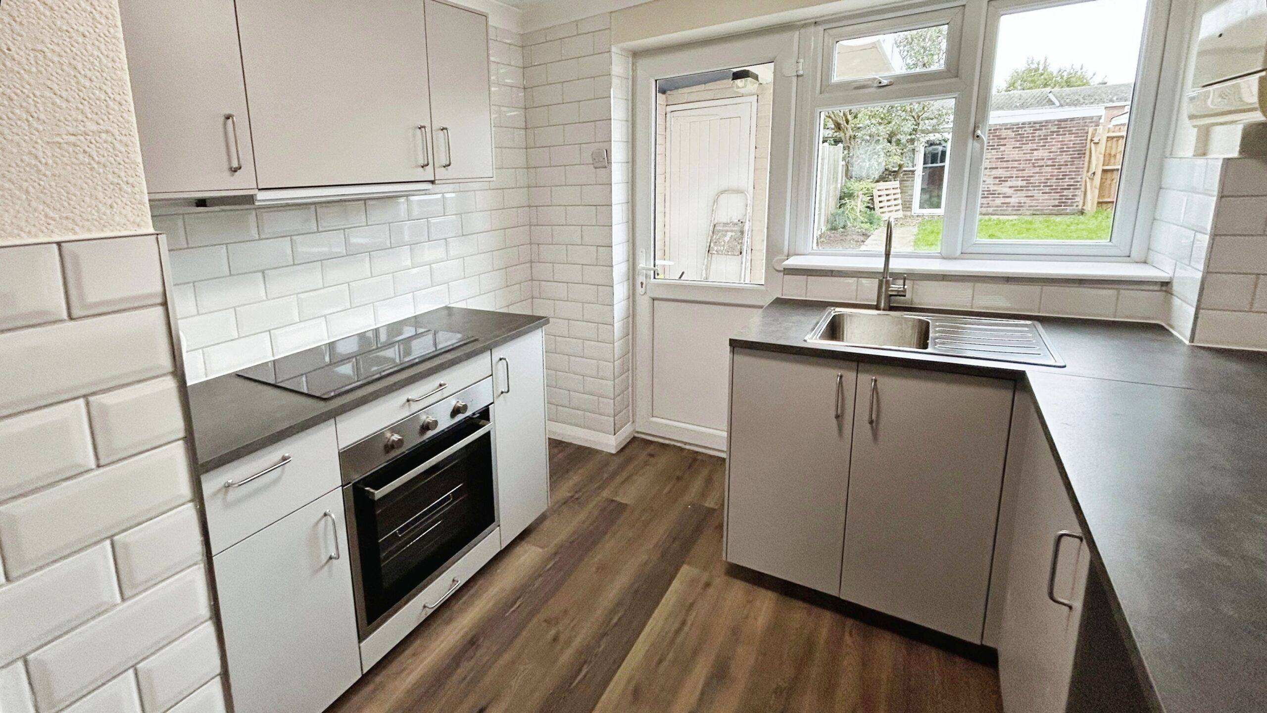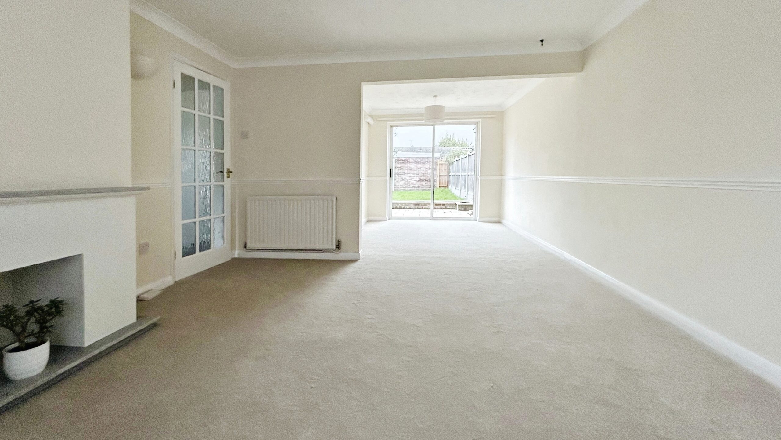 Internally the property offers a door to porch with further door to hallway. Hallway with stairs to first floor with storage cupboard under, laminate flooring, access to Open Plan Living/Dining Area and kitchen. Open Plan Living/Dining with feature fire surround, carpet flooring and patio sliding door leading to rear garden. kitchen with a range of eye and base level units, single sink and drainer with worktops over, integrated cooker and hob with extractor over, space for appliances, plumbing for washing machine, further storage cupboard, wall mounted Optia boiler, laminate flooring, door leading to rear garden. Two double bedrooms, both with carpet flooring and built in storage. Bedroom three is a single room with carpet flooring and built in storage. Bathroom with tiled walls and wood effect laminate flooring, panel bath with electric shower over, pedestal sink, low level WC. Externally the property offers well-maintained front and rear gardens, garage offering additional storage and car parking to the rear of the property.