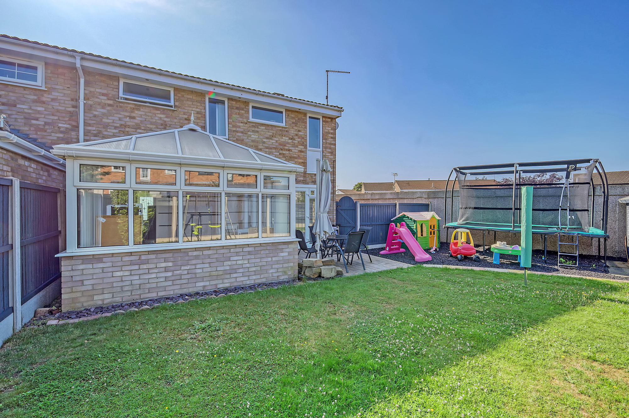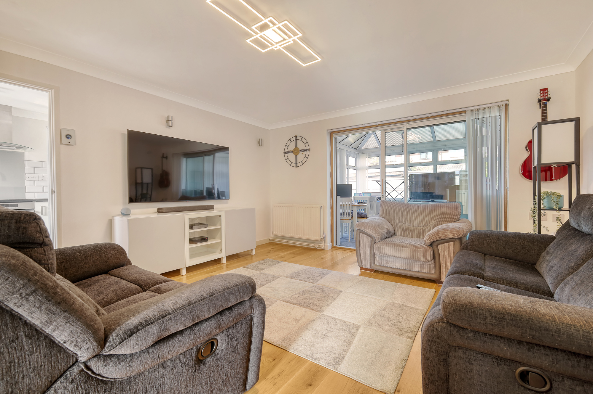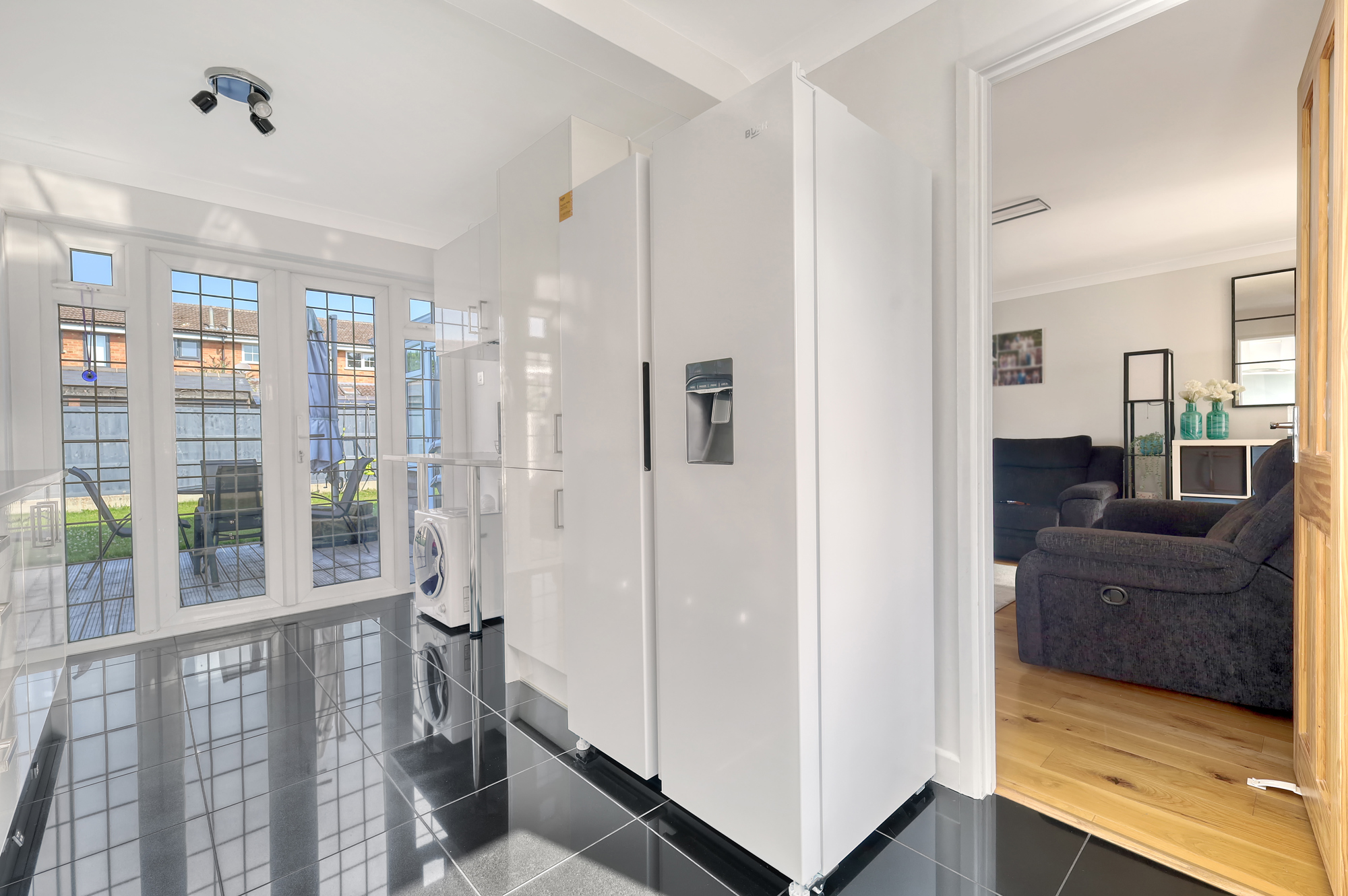 The house is accessed via a large Entrance Porch, perfect for storing coats and shoes, which in turn leads into the Living Room. The Living Room has the stairs rising to the first floor, a door into the Kitchen, and sliding doors into the Conservatory from which you can access the garden. The Kitchen has been refitted with a range of white wall and base units with worktops over, and comes with an integrated oven with hob and extractor, and integrated dishwasher and has spaces for the remaining appliances. The Kitchen is dual aspect, running the length of the house and has doors opening up onto the decked area in the Rear Garden.