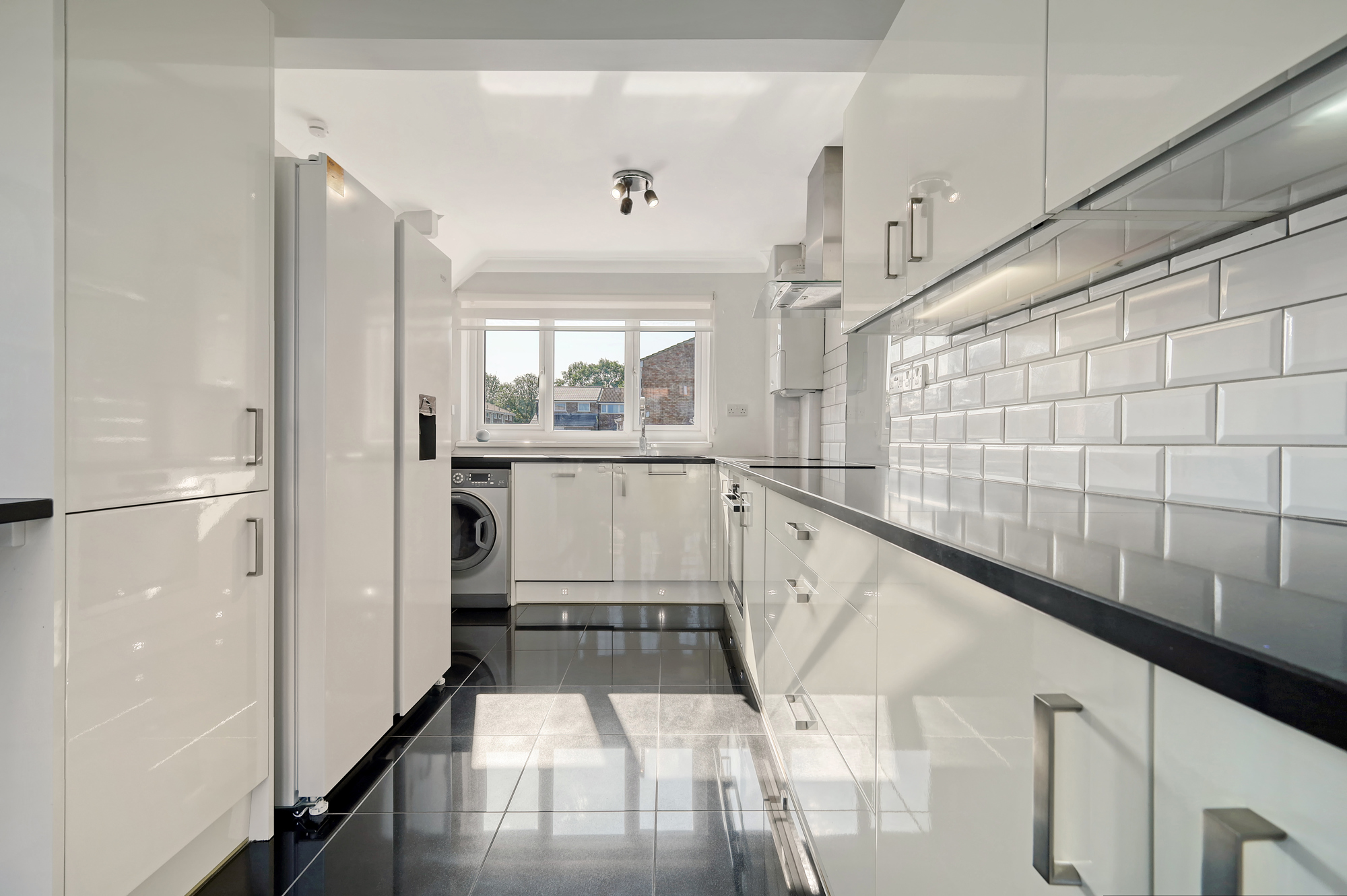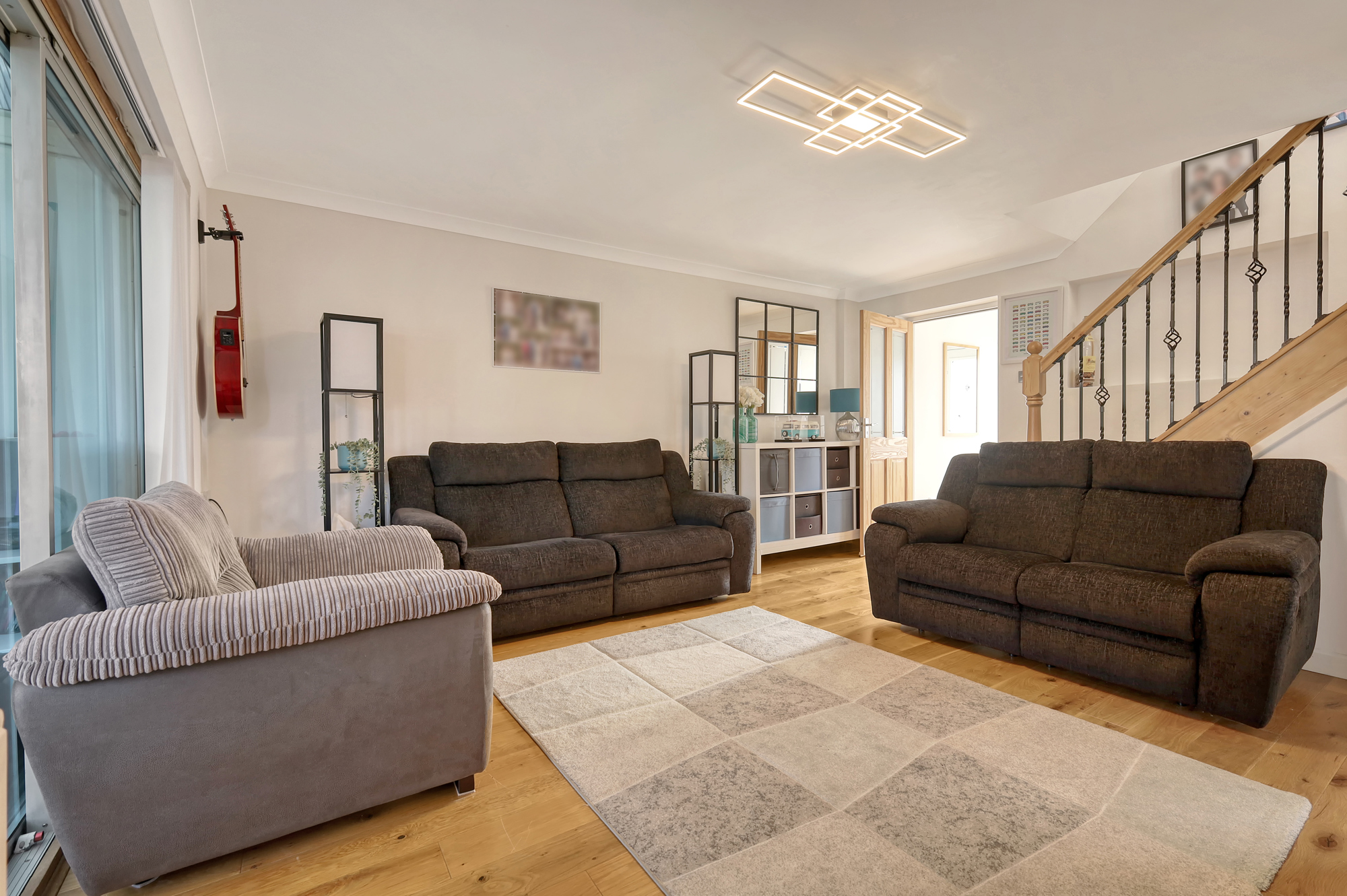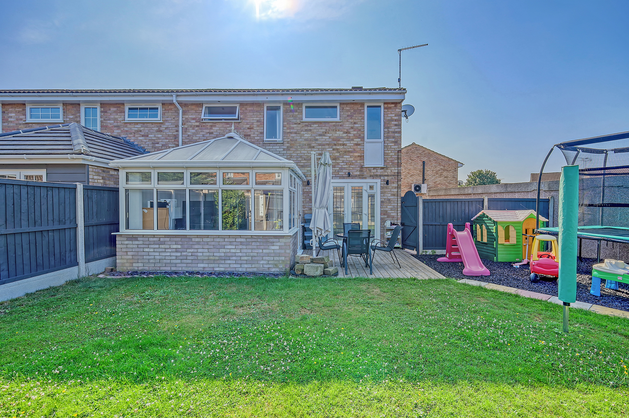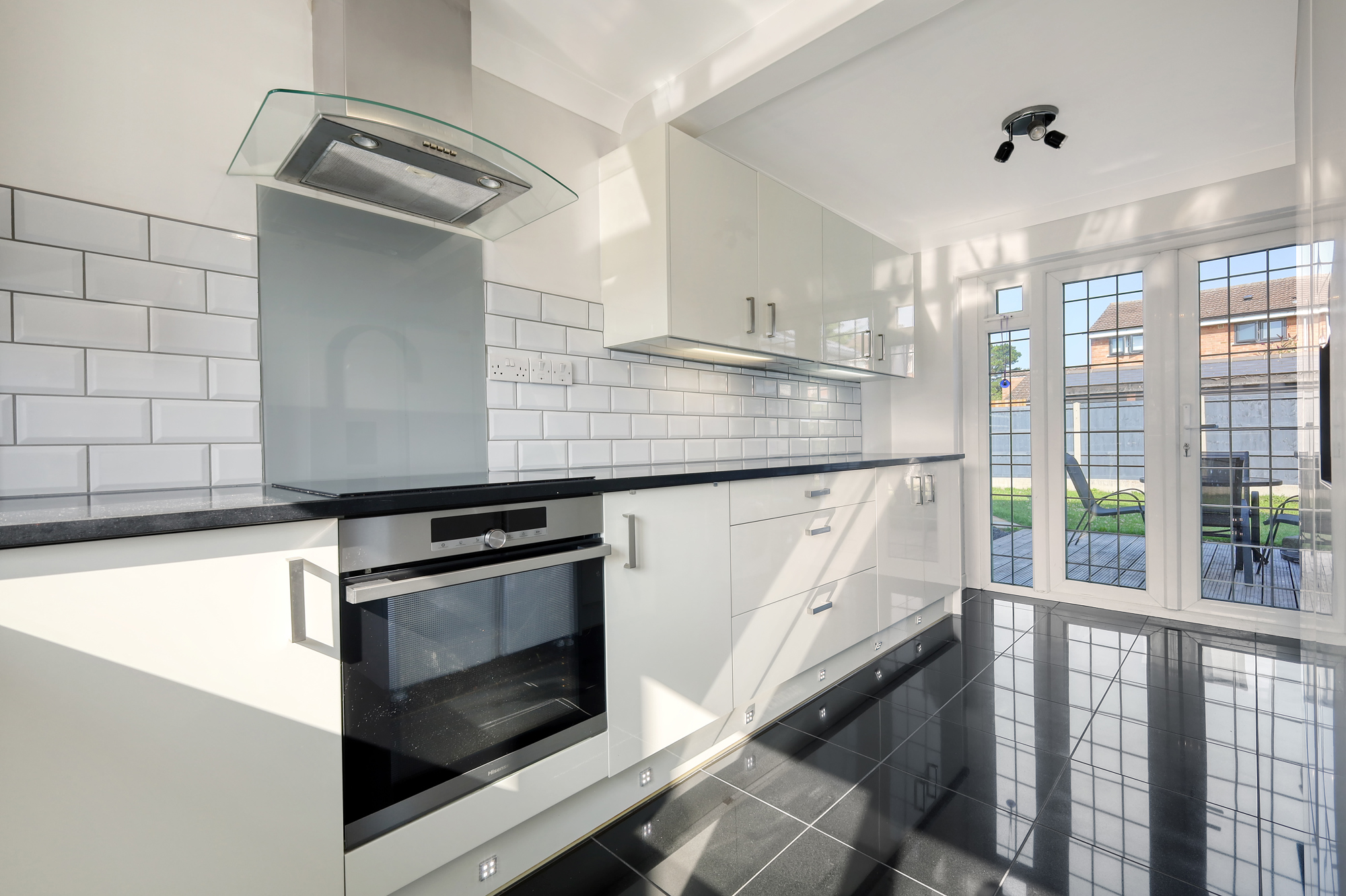 The house is accessed via a large Entrance Porch, perfect for storing coats and shoes, which in turn leads into the Living Room. The Living Room has the stairs rising to the first floor, a door into the Kitchen, and sliding doors into the Conservatory from which you can access the garden. The Kitchen has been refitted with a range of white wall and base units with worktops over, and comes with an integrated oven with hob and extractor, and integrated dishwasher and has spaces for the remaining appliances. The Kitchen is dual aspect, running the length of the house and has doors opening up onto the decked area in the Rear Garden.
