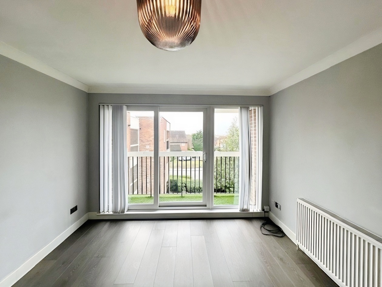The large living area offers a view over the communal gardens and floor to ceiling windows, giving access to the balcony complete with artificial grass.