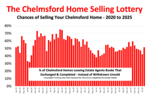 • Of the 3,833 Chelmsford properties that left estate agents’ books in 2025 (so far), 50.5% exchanged and completed. The other 49.5% of homeowners, a total of 1,896 homes, withdrew from the market unsold.
